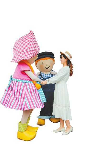 参观者(右)在荷兰展台与两名装扮成卡通人物的演员跳舞互动。新华社记者 沈伯韩 摄