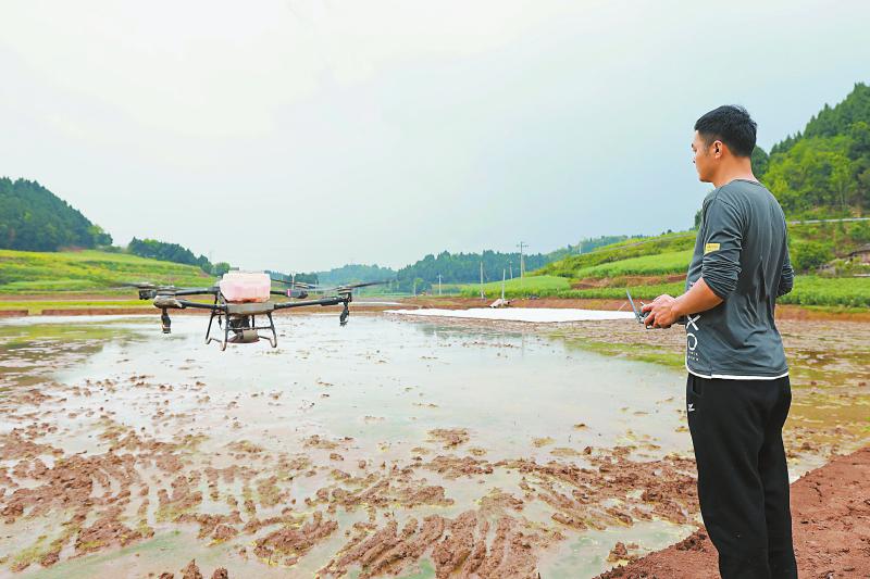 4月11日,在遂宁市安居区常理镇的田间,一架无人机正在播撒水稻种子,省去了传统种植中的人工播种、秧苗管理等环节,大幅降低了生产成本。 张勤宝 摄(C视觉)