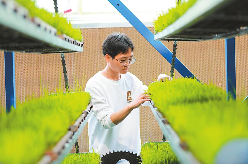 4月11日,宜宾市南溪区农技人员正在该区粮油现代农业园育苗中心察看水稻秧苗长势。该育苗中心采用智能化、自动化系统进行秧苗培育,不仅节省了人力和耕地,培育效率也更高。 罗平 摄(C视觉)