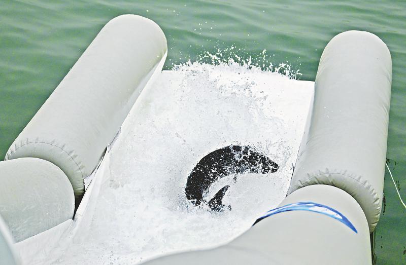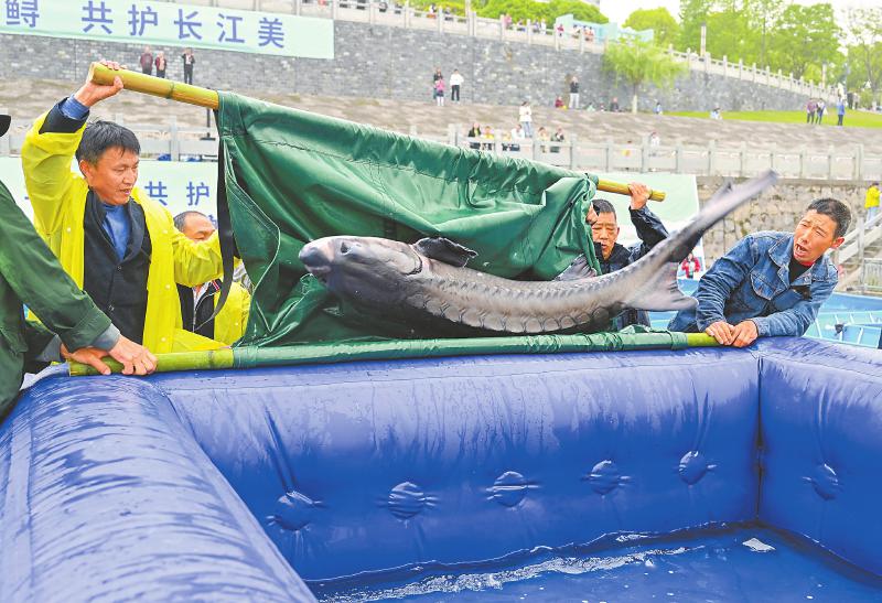 4月12日,中华鲟从放流通道滑入长江。