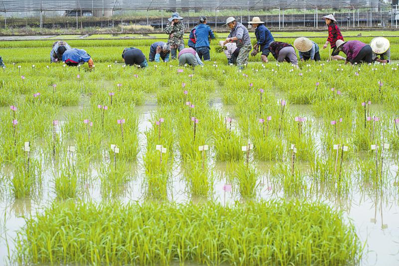 4月12日,在省农业科学院水稻高粱研究所泸县科研试验基地,科研人员和村民一同在基地稻田中移栽秧苗。这标志着今年基地新一轮科研水稻和再生稻培育研究工作正式开始。四川日报全媒体记者 何海洋 摄
