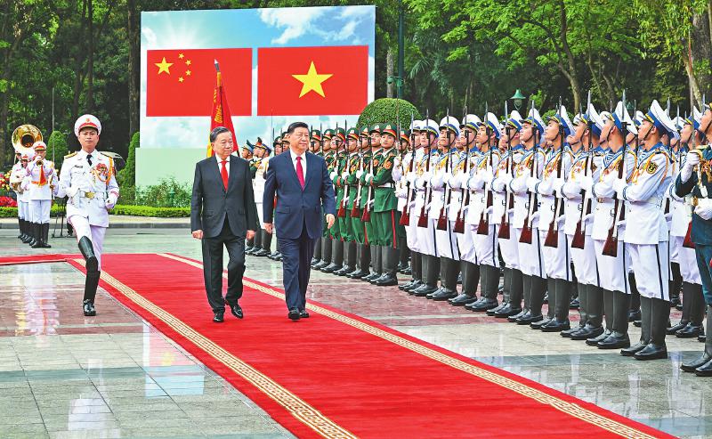 4月14日,中共中央总书记、国家主席习近平抵达河内对越南进行国事访问。当日下午,越共中央总书记苏林为习近平举行隆重欢迎仪式。这是习近平在苏林陪同下检阅仪仗队。新华社记者 李学仁 摄