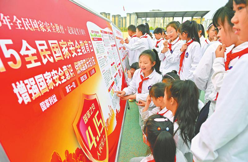4月14日,眉山市仁寿县文缜小学校开展“国家安全教育进校园”主题活动,通过知识讲解、现场问答等方式,帮助学生了解国家安全知识,提高学生维护国家安全的意识和能力。图为学生观看知识展板。 潘建勇 摄(C视觉)