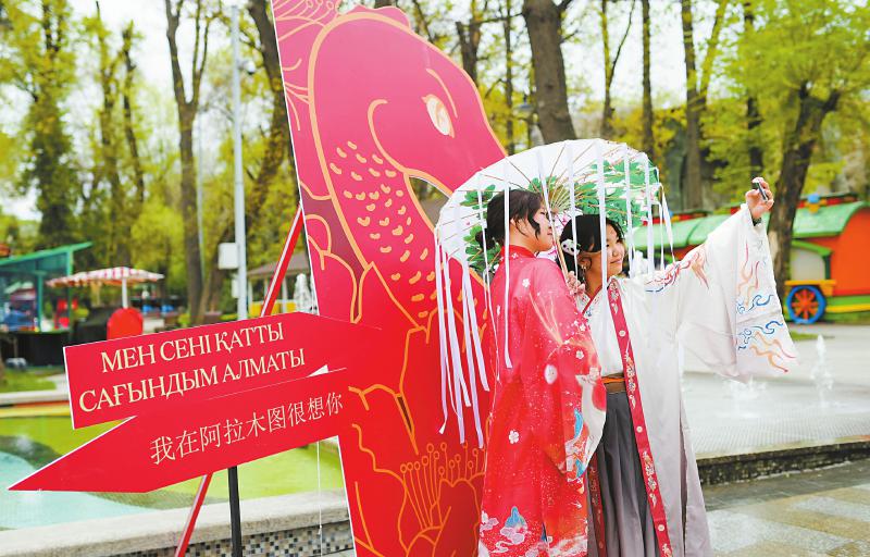 “国际中文日”庆祝活动19日在哈萨克斯坦阿拉木图中央休闲公园举办。本次活动以“中文:穿越时空的礼物”为主题,设置了包括书法、国画、汉服打卡等中国文化体验活动,以及古筝演奏、互动游戏等。中哈政商学界代表、文化团体、中文专业师生代表和中国文化爱好者欢聚一堂,感受中华文化之美。 新华社记者 李任滋 摄