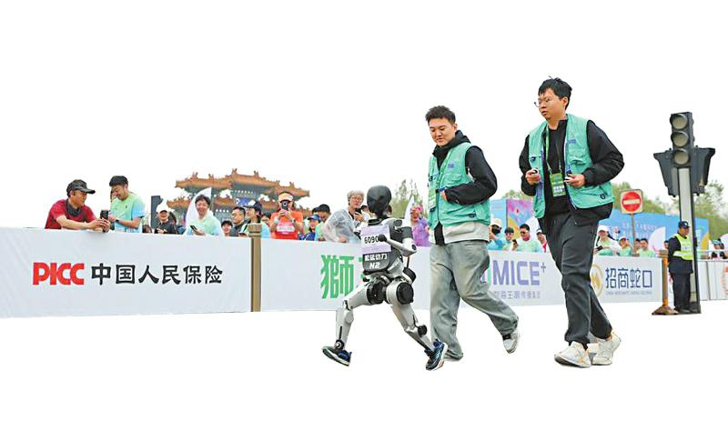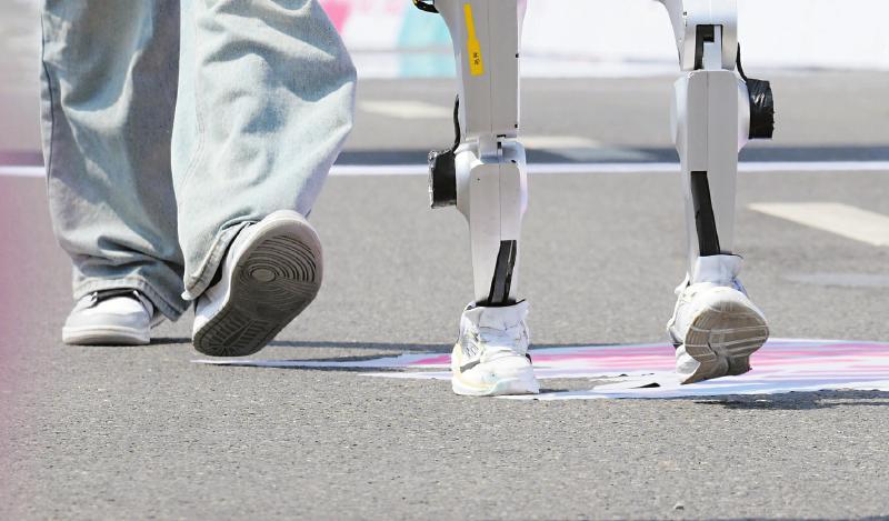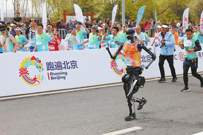 4月19日,小顽童队选手松延动力N2(前左一)在比赛中。新华社记者 曹灿 摄