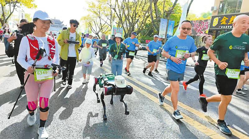 赛号为6666的机器狗领跑2025峨眉山越野挑战赛世遗文化亲子组后,融入人群同行。 乐山观察 牛萍 摄