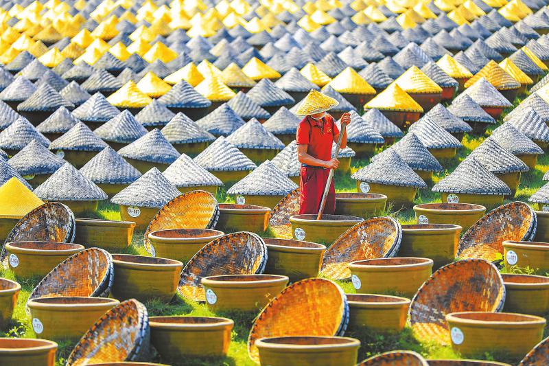 4月18日,泸州市合江县永兴诚酱油文化博览园开园迎客,工人在晒场里翻晒酱醪。 李贵平 摄(C视觉)