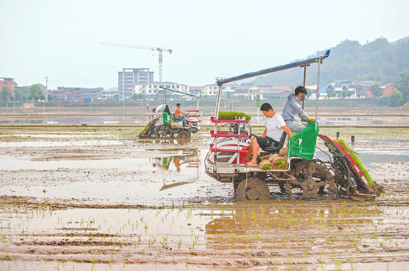 4月21日,宜宾市南溪区大观镇“天府粮仓”现代农业示范基地核心区2380亩水稻开始栽插,农机手驾驶着插秧机插秧。 罗平 摄(C视觉)