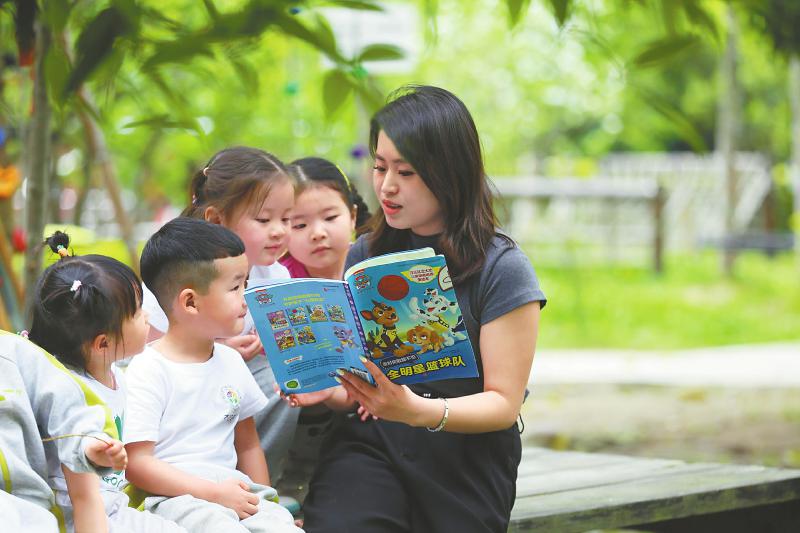 4月22日,乐山市实验幼儿园开展主题读书活动,老师带领小朋友在校园内阅读绘本。 李华时 摄(C视觉)
