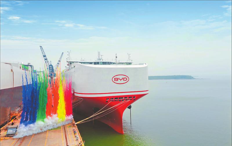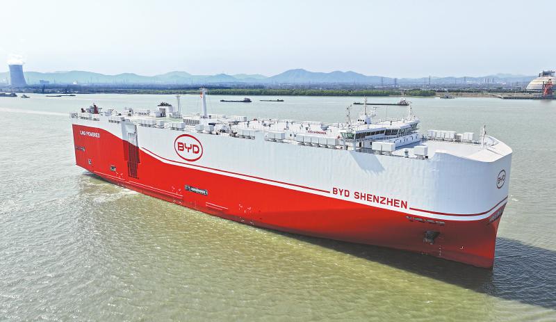 4月22日,中国新能源汽车龙头企业比亚迪第四艘汽车运输船“深圳号”(BYD SHENZHEN)在江苏仪征正式交付。该船是比亚迪的第四艘专业汽车运输船,由招商局旗下金陵船厂制造,总长219.9米,型宽37.7米,共16层甲板,拥有9200个标准装载车位,是目前已投入运营的全球装载量最大的汽车运输船。 新华社发