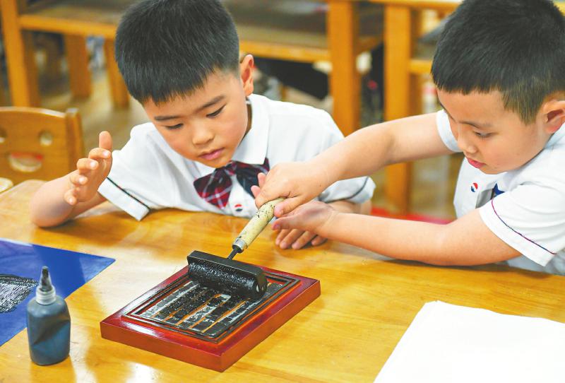 4月21日,在南充阆中市第一幼儿园,小朋友体验活字印刷术,在宣纸上印刷古诗并一起吟诵。 王玉贵 摄(C视觉)