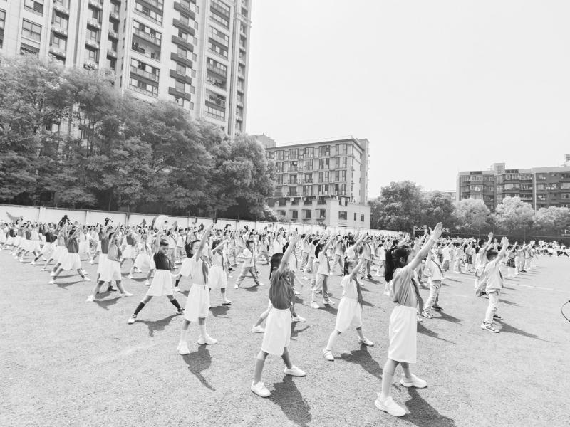 成都玉林中学附属小学2025年春季田径运动会上,学生表演武术操。