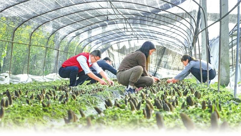 省港投集团青川食用菌产业示范园内,帮扶干部和群众一起采收羊肚菌。