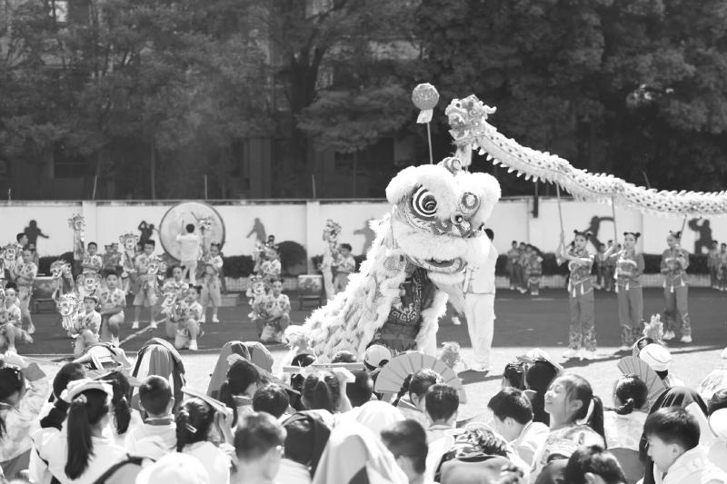 舞龙舞狮社团参演成都玉林中学附属小学2024年春季田径运动会开幕式。