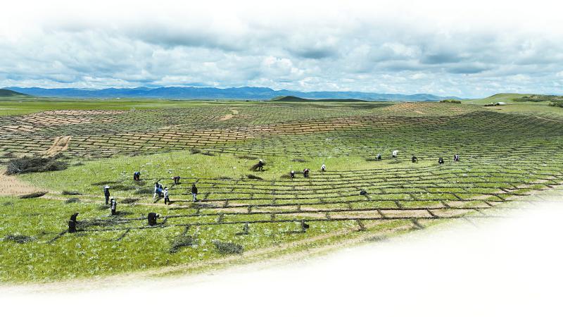 若尔盖县辖曼镇治沙现场,群众正编织高山柳沙障。 若尔盖县融媒体中心供图 (资料图片)
