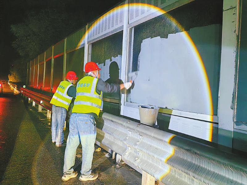 施工人员深夜为透明围挡刷深色漆。沐川县林业局供图