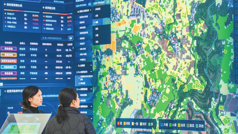 技术人员正在通过卫星遥感系统分析农作物长势,精准制定田间管理方案。 翁光建 摄