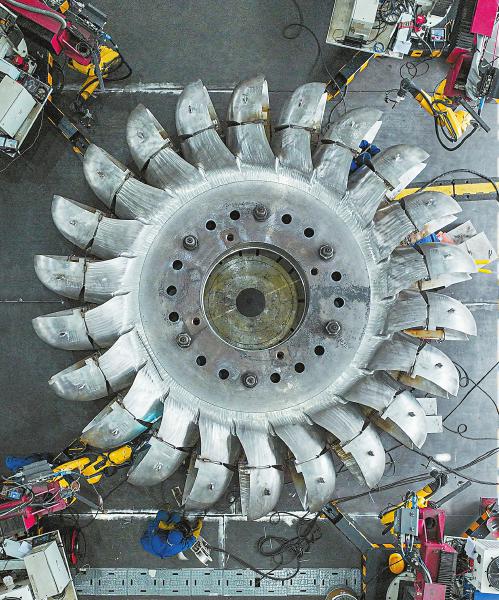 4月15日,东方电气集团东方电机有限公司焊接分厂内,机械臂正在进行世界首台500兆瓦冲击式转轮外部水斗焊接。