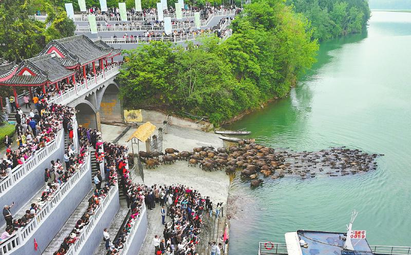 4月27日,游客在南充市蓬安县相如街道油房沟社区观赏“百牛渡江”。刘永红 摄(C视觉)