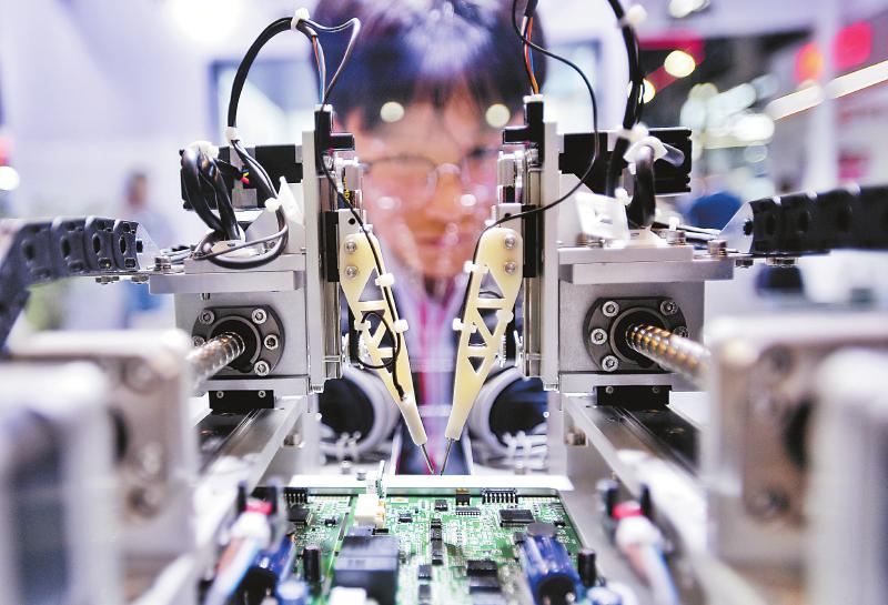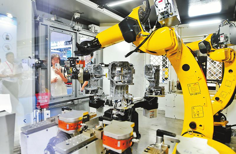 4月23日,参会者在2025成都国际工业博览会全传科技展区,仔细观察运行顺畅的旋转式精密滚珠螺杆的应用。