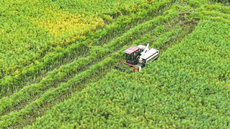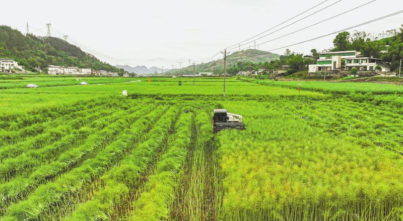 4月24日,高县粮油现代农业园区的5000亩油菜开镰收割。园区采取两段式机械化作业,加快抢收油菜,为接下来的水稻移栽打好时间提前量。 陶坤 摄(C视觉)