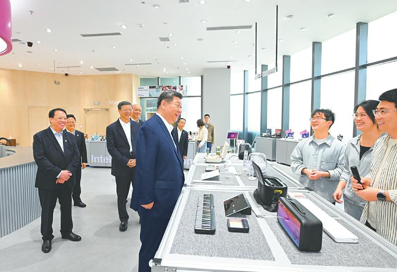 四月二十九日,中共中央总书记、国家主席、中央军委主席习近平在上海考察。这是习近平在位于徐汇区的上海“模速空间”大模型创新生态社区人工智能产品体验店考察。新华社记者谢环驰摄