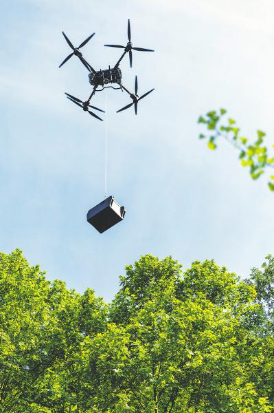 首趟运送物资的无人机飞往目的地。