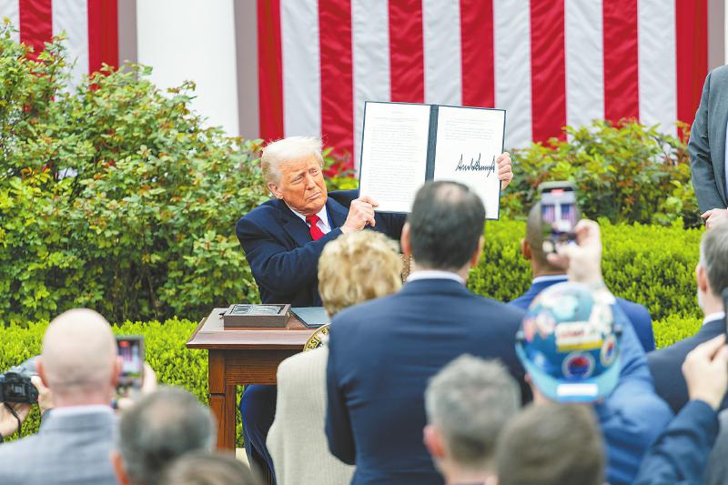4月2日,美国总统特朗普在华盛顿白宫展示签署后的关于所谓“对等关税”的行政令。 新华社记者 胡友松 摄
