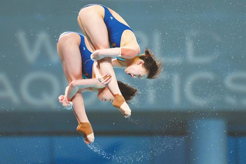 2025年世界泳联跳水世界杯总决赛2日在国家游泳中心“水立方”开赛,中国跳水队夺得首个比赛日的全部5枚金牌。陈芋汐(前)/全红婵夺得女子双人10米台金牌。新华社记者 鞠焕宗 摄