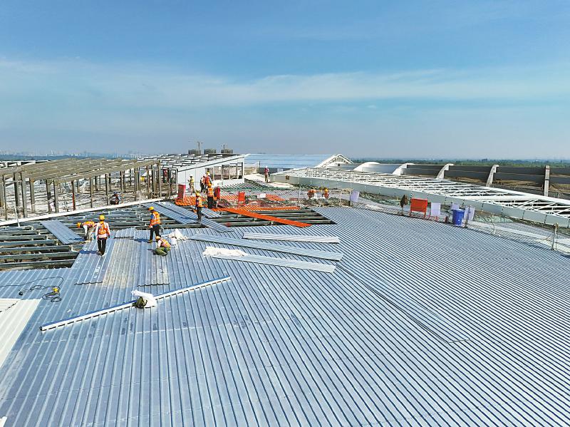 5月1日,四川最大高铁站——天府站建设现场一派繁忙景象。建设者坚守施工一线,全力推进金属屋面的大面积施工作业。 周俊艺 摄(C视觉)