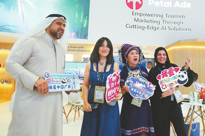 4月30日,在阿联酋迪拜举行的阿拉伯旅游展上,外国旅游商在中国展区同身着民族服装的工作人员合影。为期4天的2025年阿拉伯旅游展5月1日在阿联酋迪拜落幕。展览期间,中国展区推介的中国入境游受到关注。新华社记者 温新年 摄