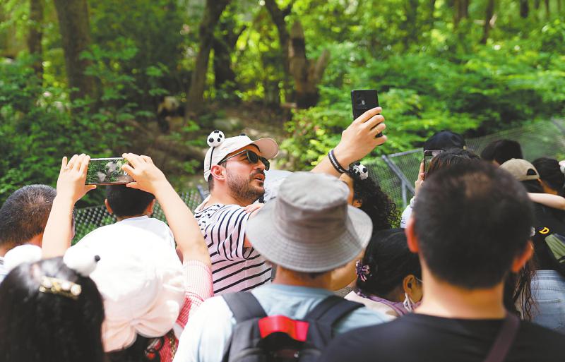 五月一日,成都大熊猫繁育研究基地迎来客流高峰,一位外国游客举起手机跟大熊猫合影。四川日报全媒体记者李强摄