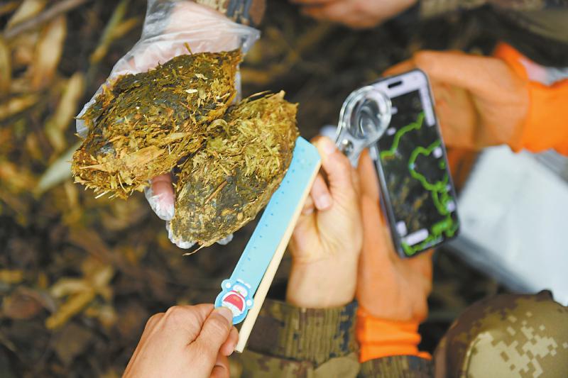 4月28日,巡护队员在汶川县绵虒镇沙排村毛毛沟样线对发现的大熊猫粪便进行数据记录。