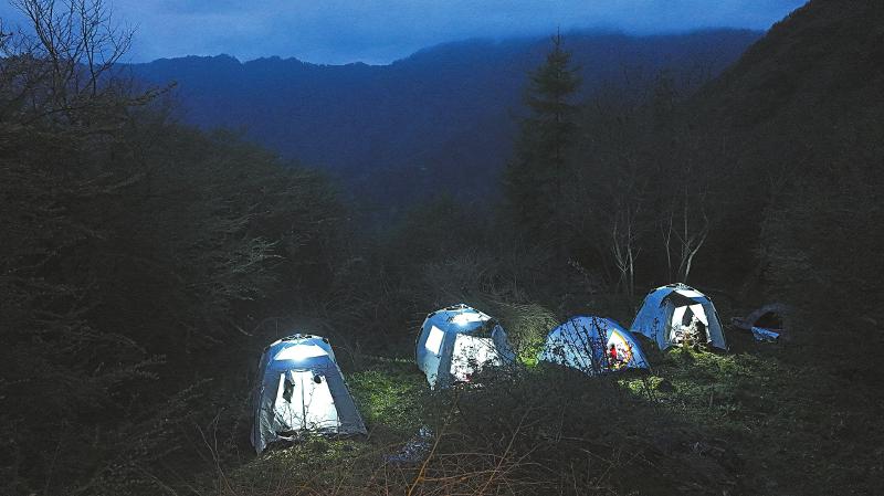 4月28日夜,巡护队员在海拔2900米左右的大熊猫国家公园核心区丫丫棚样线安营扎寨。