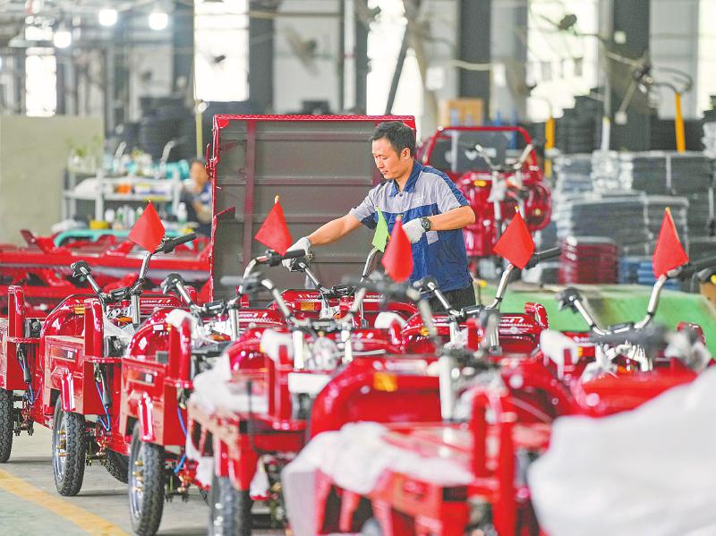 近日,在四川眉山天府新区视高工业园,工人在调试刚刚下线的电动三轮车。