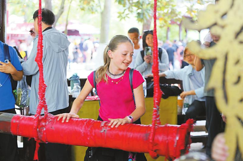 五月二日,境外游客在乐山大佛景区撞钟祈福、拍照留念。李华时摄(C视觉)