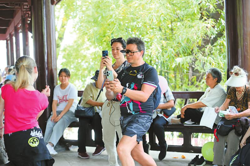 “五一”假期,境外游客在成都武侯祠博物馆主办的“蜀汉百景集”上观赏剪纸艺术。成都武侯祠博物馆供图