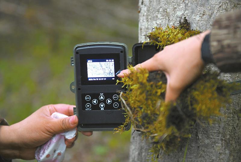 4月28日,巡护队员在山林中查看红外线相机的工作状况。