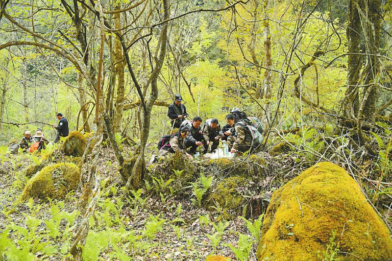 4月29日,巡护队员在样线巡护途中共进午餐,吃干粮充饥是队员们野外巡护的家常便饭。