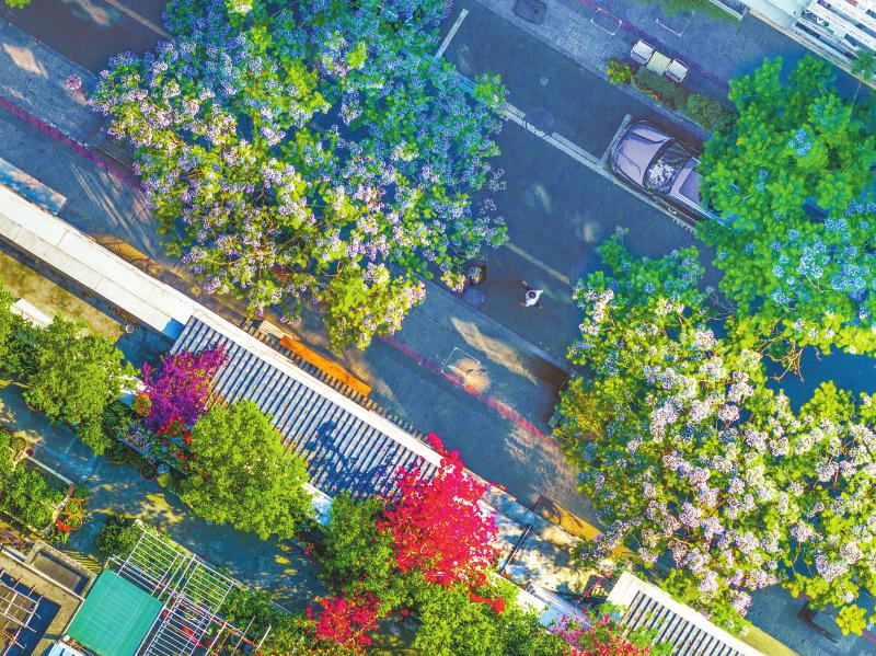 5月12日,成都小通巷的蓝花楹和三角梅等绽放,为城市增添了一抹绚丽色彩。 林漫 摄(C视觉)