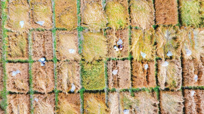 5月11日,四川省大邑县现代农业(粮食产业)园区,工人在试验田中开展小麦新品的测产工作。 李旭 摄(C视觉)