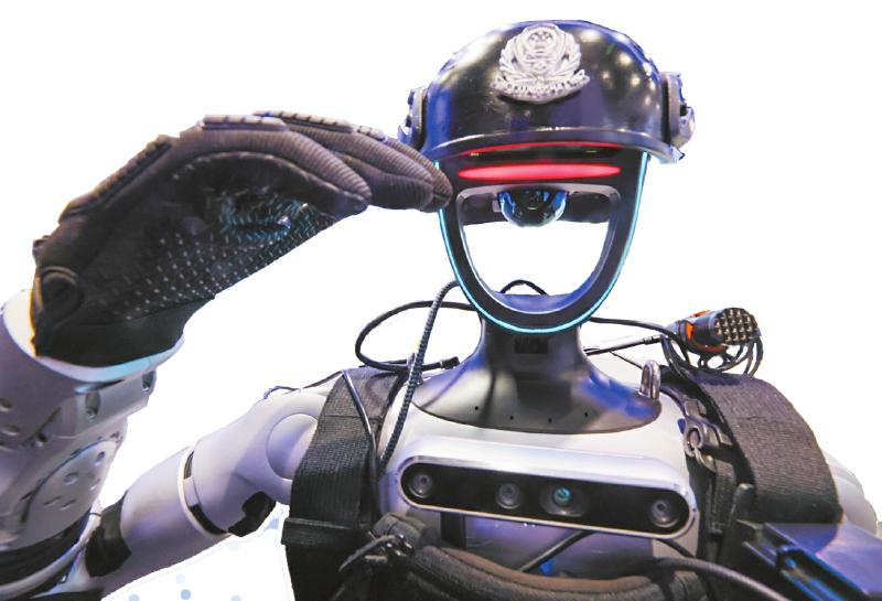 具身人形智能警务机器人在举手敬礼。新华社记者 殷刚 摄