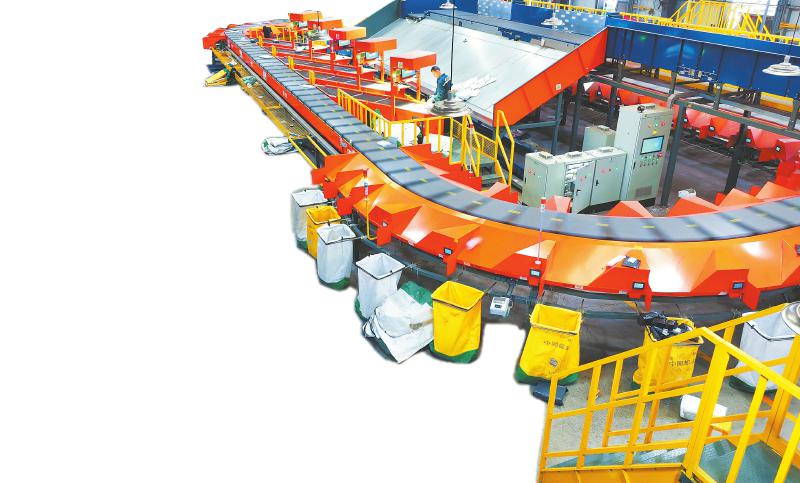 在中国邮政一处邮件处理中心,工作人员正在智能快递流水线上分拣货物。潘帅摄(C视觉)
