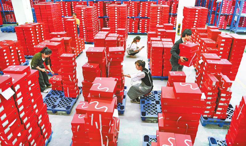 在成都市武侯区鞋都南三路百丽物流大厦,工人正在仓库发货。 四川日报全媒体记者 李向雨 摄