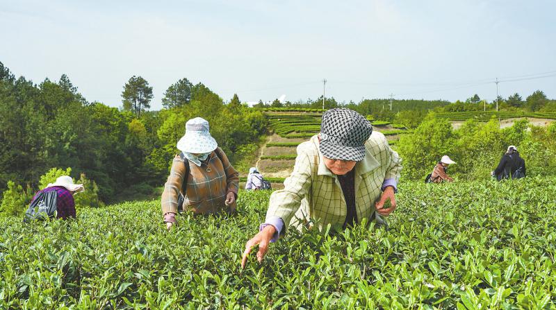 近日,平昌县金宝街道石庙村的千亩茶园里,茶农在茶垄间采摘茶芽。 张书浩 摄