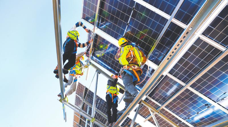 工人在安装光伏板。