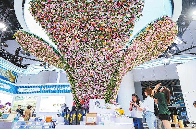 5月26日,观众在云南馆内用鲜花制作的大型艺术装置前拍照。四川日报全媒体记者 李强 摄