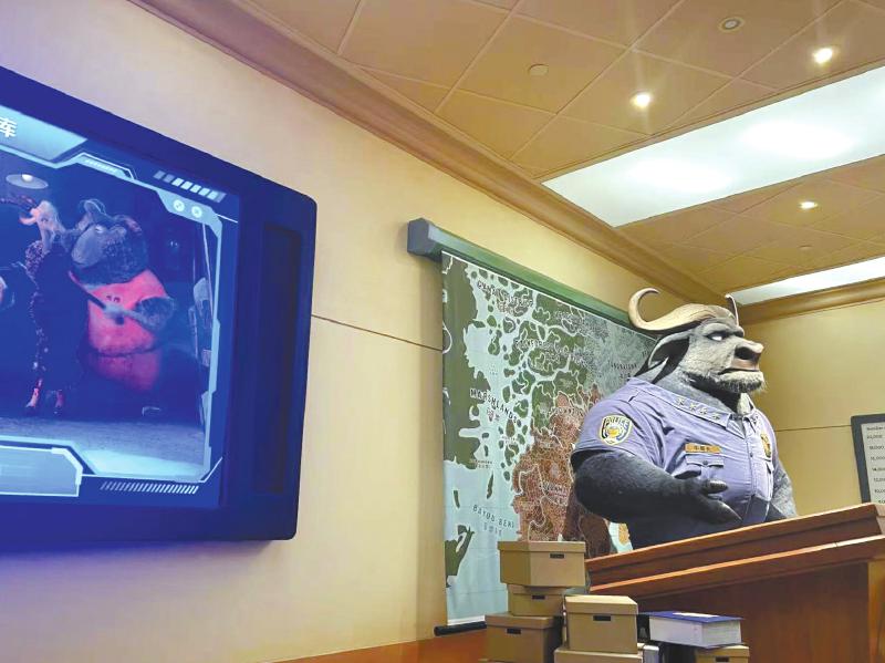 “疯狂动物城”主题园区内的牛局长机械动画人偶。杨婷丹 摄