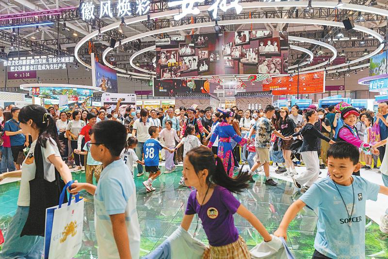深圳文博会四川展馆的表演者和观众一起跳起沙朗锅庄。