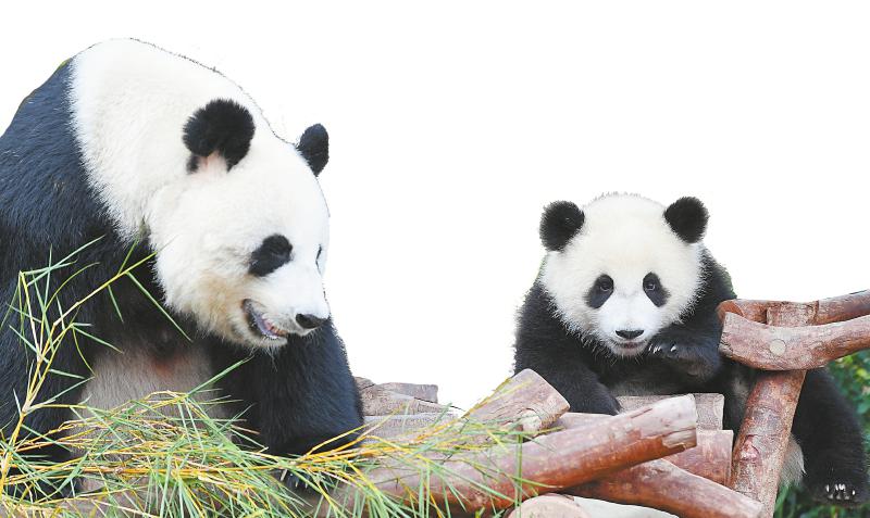 5月27日,在香港海洋公园“大熊猫之旅”展馆内,雌性大熊猫宝宝“加加”(右)与妈妈“盈盈”在一起。新华社记者 陈铎 摄